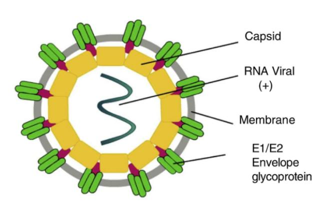 CHIKV屬于披膜病毒科(Togaviridae)甲病毒屬(Alphavirus),病毒顆粒呈球形,直徑約60–70 nm,外層為脂質(zhì)包膜,內(nèi)部包裹正鏈RNA基因組和核衣殼。包膜表面鑲嵌E1-E2糖蛋白形成的三聚體刺突,介導病毒與宿主細胞受體結(jié)合及膜融合過程。
