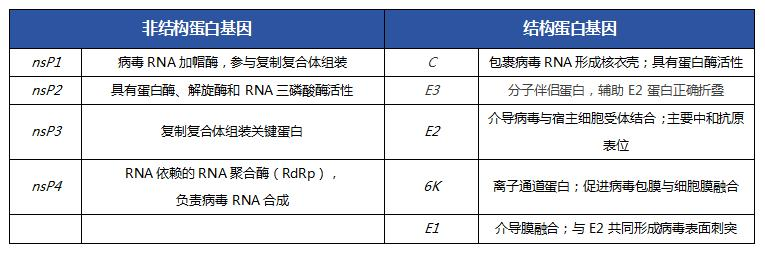 CHIKV基因組為單股正鏈RNA,全長約11.8 kb,編碼4個非結(jié)構蛋白(nsP1~nsP4)和5個結(jié)構蛋白(C、E3、E2、6K、E1)。非結(jié)構蛋白主要參與病毒基因組復制和宿主免疫調(diào)控,位于基因組5'端,結(jié)構蛋白位于基因組3'端,形成病毒顆粒并介導宿主細胞入侵。