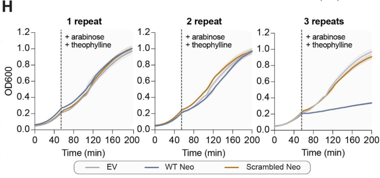 有趣的是,細菌被T5噬菌體感染后,體內(nèi)除了ncRNA逆轉(zhuǎn)錄的cDNA外,還會出現(xiàn)大量與ncRNA鏈性相反、包含多個重復(fù)的RNA序列,可達到未感染細菌的~10000倍。隨后實驗結(jié)果也表明合成的cDNA互補鏈可能是RNA聚合酶另一輪轉(zhuǎn)錄的模板鏈,所得轉(zhuǎn)錄本將具有與初始ncRNA相反的鏈性,并可以包含不同數(shù)量的cDNA重復(fù)序列。那么串聯(lián)的重復(fù)cDNA轉(zhuǎn)錄形成的RNA在抗噬菌體免疫反應(yīng)中又有著怎樣的作用呢?利用算法預(yù)測,單個cDNA具有一種沒有任何終止密碼子的ORF區(qū)域。RCRT在每次“跳躍”時會增加1個額外堿基,產(chǎn)生了1個120bp的cDNA重復(fù)單元,該重復(fù)單元恰好包含40個正義密碼子。這種重復(fù)單元確保了每次串聯(lián)復(fù)制中ORF的完整性,并產(chǎn)生了連續(xù)的ORF。令人驚奇的是,一個cDNA重復(fù)單元的末端與下一個cDNA重復(fù)單元的起始端形成了1個全新的啟動子,具有典型的-10和-35區(qū)域。至此,這些基于RCRT機制產(chǎn)生的串聯(lián)重復(fù)cDNA形成了1個全新的編碼基因,并且ORF內(nèi)沒有任何終止密碼子,研究者們將其命名為Neo(never-ending ORF)。