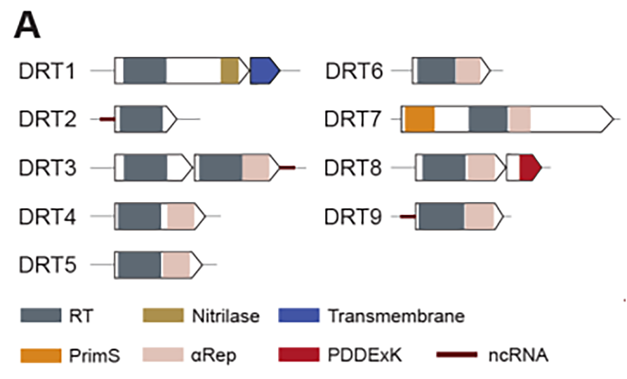 防御相關(guān)逆轉(zhuǎn)錄酶(Defense-associated Reverse Transcriptase, DRT)是細菌中除RT-Cas1和retron外的第三類具有抗噬菌體功能的逆轉(zhuǎn)錄系統(tǒng),被劃分為9個亞組(DRT1-9)。DRT系統(tǒng)中逆轉(zhuǎn)錄元件具有單基因操縱子的特征,這意味DRT系統(tǒng)可能僅依靠逆轉(zhuǎn)錄功能實現(xiàn)了噬菌體防御。但在此之前DRT系統(tǒng)中cDNA產(chǎn)物功能及免疫機制都是未知的。