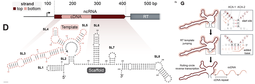 DRT2系統(tǒng)中ncRNA鏈的堿基之間互補配對,折疊形成一個具有很多保守莖環(huán)(stem-loop,SL)的二級結(jié)構(gòu),其中由SL2短莖連接的、具有較大3’區(qū)域的RNA區(qū)域是RT合成cDNA的模板。RT以SL2相鄰區(qū)域的UCU作為起始位點,沿著模板區(qū)域3’→5’方向移動。回到SL2區(qū)域時,RT“躍過”SL2環(huán)狀結(jié)構(gòu)再次移動到起始位點UCU,繼續(xù)進行下一輪的逆轉(zhuǎn)錄。這種獨特的機制導(dǎo)致了cDNA片段不斷串聯(lián)累加,形成了串聯(lián)多個重復(fù)序列的cDNA,最長可達到40個重復(fù)。研究者將這一現(xiàn)象稱為滾環(huán)逆轉(zhuǎn)錄(rolling-circle reverse transcription,RCRT),類似于DNA的滾環(huán)復(fù)制。