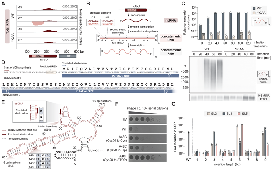 該研究聚焦于肺炎克雷伯菌的DRT2系統(tǒng)(KpnDRT),因為該亞族系統(tǒng)結(jié)構(gòu)簡單,僅由單個編碼逆轉(zhuǎn)錄酶(Reverse Transcriptase,RT)的開放閱讀框(ORF)及其上游的非編碼RNA(non-coding RNA,ncRNA)構(gòu)成,后者此前未發(fā)現(xiàn)具有確切功能。與其它DRT系統(tǒng)或retron系統(tǒng)不同,DRT2系統(tǒng)缺乏額外的蛋白質(zhì)編碼基因,并且RT僅具有RNA導(dǎo)向DNA聚合酶的結(jié)構(gòu)域,也沒有預(yù)測到除此以外的其它功能結(jié)構(gòu)域。因此研究人員提出1個假設(shè):逆轉(zhuǎn)錄酶合成的cDNA產(chǎn)物可能在DRT2免疫機制中起著關(guān)鍵、核心作用。