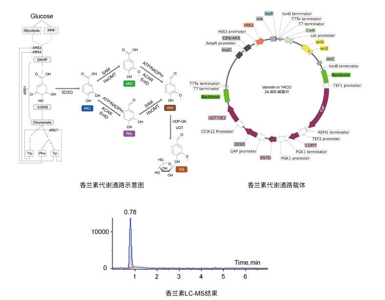 我們根據(jù)宿主釀酒酵母特征對(duì)不同來(lái)源的基因進(jìn)行密碼子優(yōu)化,并設(shè)計(jì)單獨(dú)的啟動(dòng)子和終止子,組成完整的單基因表達(dá)框。結(jié)果顯示,在低拷貝的pSynoYAC0載體上,該通路能夠完整表達(dá)各個(gè)蛋白酶,成功實(shí)現(xiàn)葡萄糖到葡糖香蘭素的生物轉(zhuǎn)化。