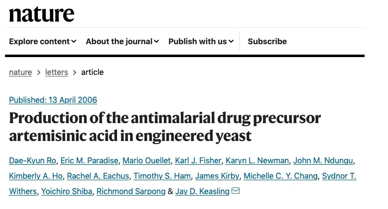 2006年4月, Jay Keasling的團隊成功地在面包酵母中構(gòu)建了青蒿酸的生物合成途徑,使其產(chǎn)生出100毫克/升的青蒿酸。通過基因編輯和基因表達調(diào)控等技術(shù),對酵母中MVA途徑代謝調(diào)控關(guān)系的調(diào)整,關(guān)鍵基因表達量的優(yōu)化,前提物FPP代謝支路的削弱,結(jié)合氧化酶CYP71AV1的表達,研究團隊成功構(gòu)建生產(chǎn)青蒿酸的酵母菌株。