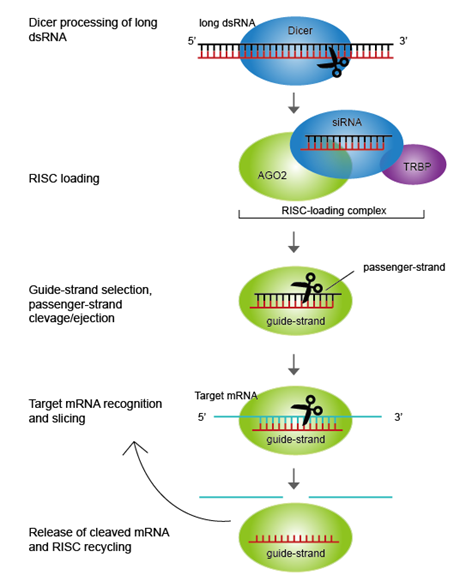 3. 靶mRNA切割或翻譯抑制:RISC復(fù)合物中的“核酸酶活性中心”利用導(dǎo)引鏈作為模板,對靶mRNA進行特定位置的剪切,從而破壞其結(jié)構(gòu),并導(dǎo)致其降解或者翻譯受到抑制。這種特異性的靶向降解或翻譯抑制是siRNA的關(guān)鍵作用機制。
