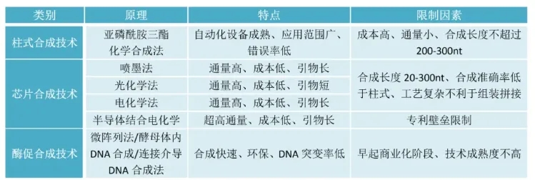 DNA合成技術主要分為化學法和酶促法。酶促法能從頭合成1005個堿基的DNA序列,這是單次合成最長的寡核苷酸。但酶促合成技術成本高,尚未實現(xiàn)大規(guī)模的商業(yè)應用。目前最為成熟且被廣泛應用的依舊是化學法,包括柱式合成技術、芯片合成技術。