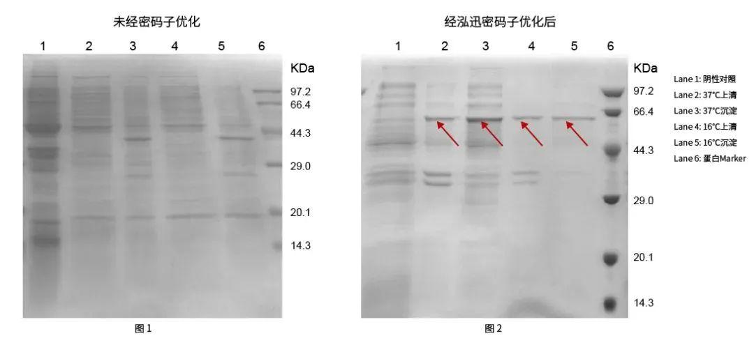 蛋白R(shí)0103,分子量53.48kDa,未優(yōu)化序列分別構(gòu)建于pET-28a(+)載體,采用37℃及16℃兩種條件進(jìn)行異源蛋白表達(dá),未優(yōu)化的序列未見(jiàn)目的蛋白表達(dá),經(jīng)過(guò)泓迅科技NGTMCodon密碼子優(yōu)化2.0在37℃和16℃均有顯著目標(biāo)蛋白表達(dá)。